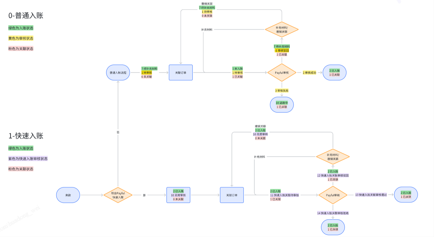 | 11. | 入账状态 | status | M | Number | 入账状态: 1-未入账 2-已入账 3-入账中 4-入账失败 7-待补充材料 8-入账复核中 10-退款中 11-退款待确认 12-退款成功 |