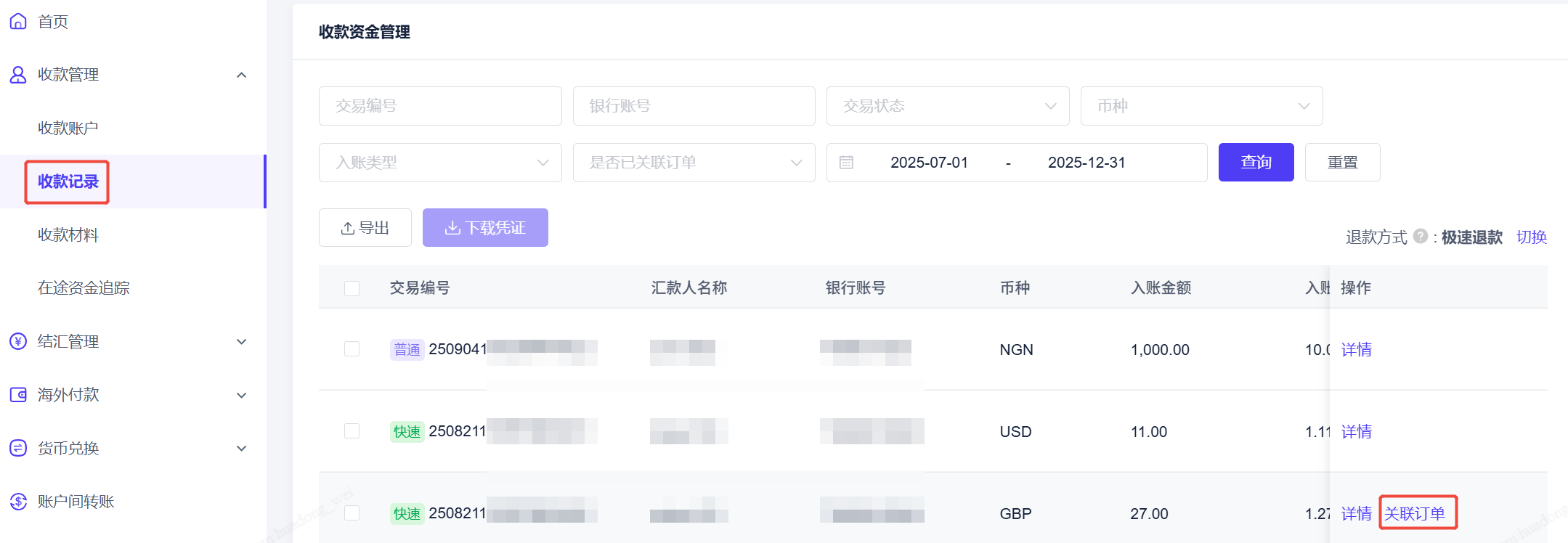 点击【收款管理】-【收款记录】,可查看待入账的交易订单;