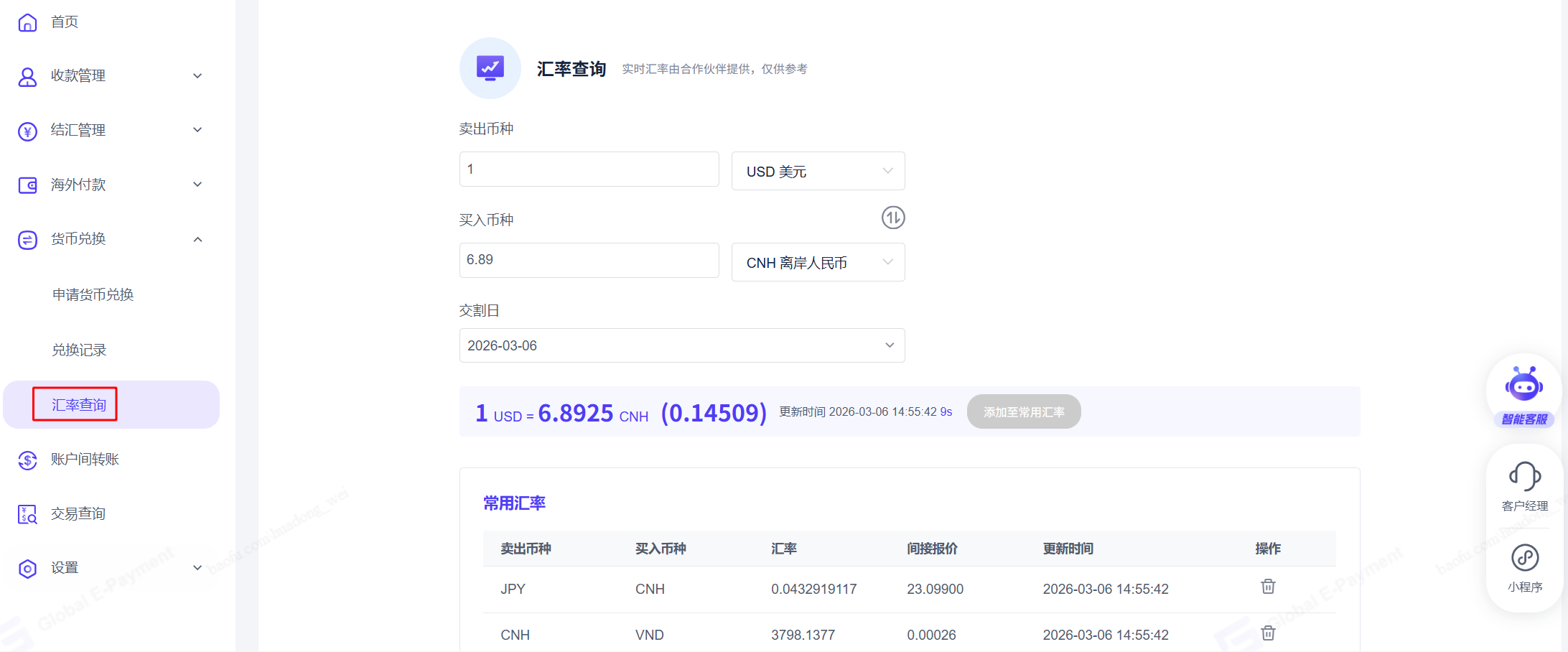 点击【货币兑换】-【汇率查询】,可以查询指定货币对的实时汇率,并将关注的货币对添加至常用汇率中。