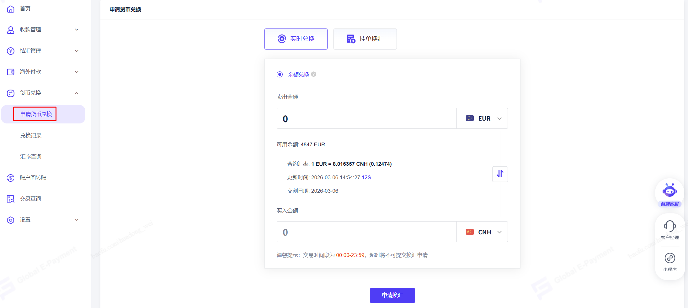 点击【货币兑换】-【申请货币兑换】-【实时兑换】,可以使用账户余额进行货币兑换。