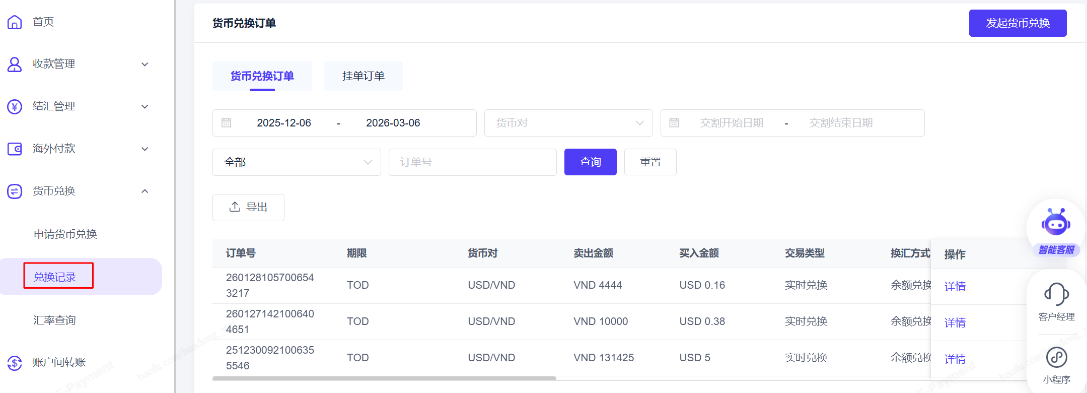 点击【货币兑换】-【兑换记录】,可以查看历史的货币兑换记录。