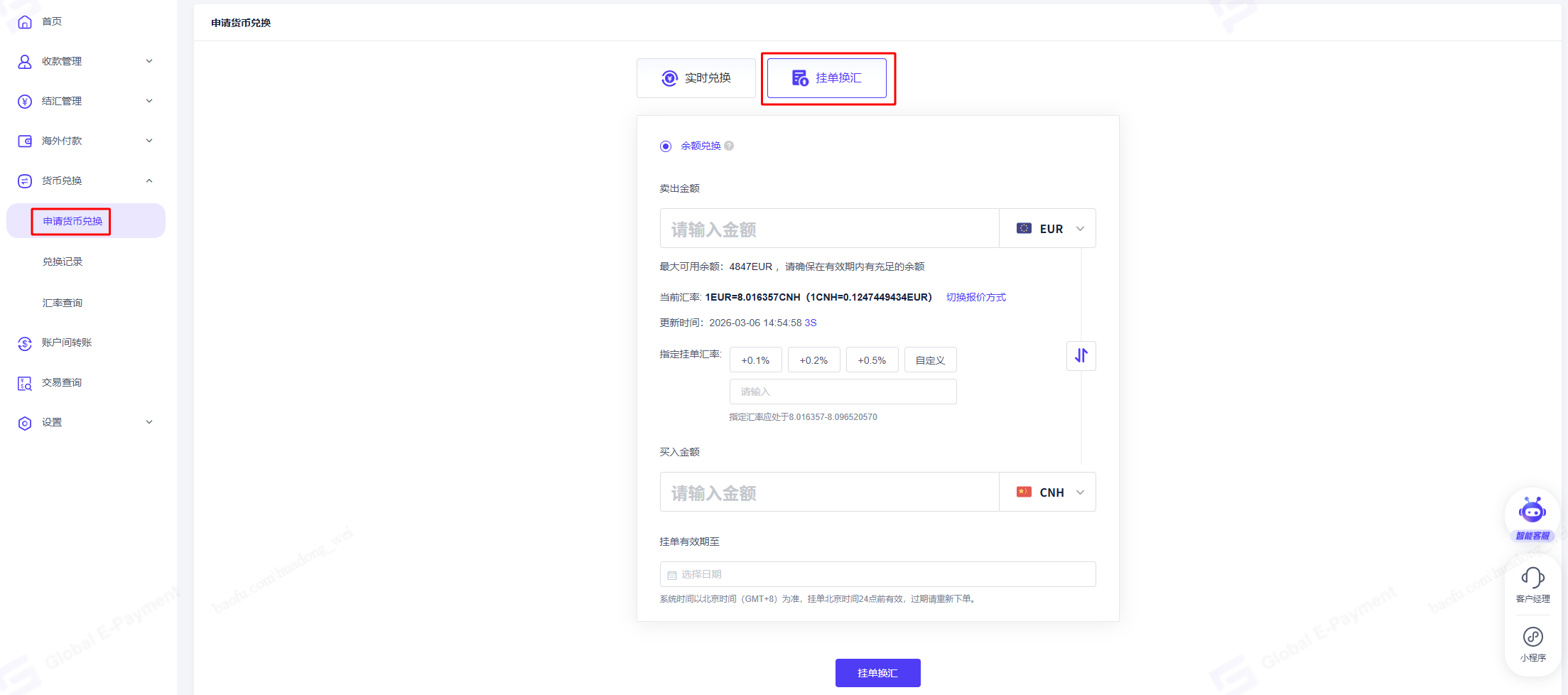 点击【货币兑换】-【申请货币兑换】-【挂单换汇】,选择卖出币种和金额,并设定目标汇率和挂单有效期后,可以发起挂单换汇。在挂单有效期前,系统会持续监控汇率是否达到指定的换汇汇率,余额充足且达到指定汇率后,系统会自动进行货币兑换,挂单换汇交易成功,否则交易将失败。