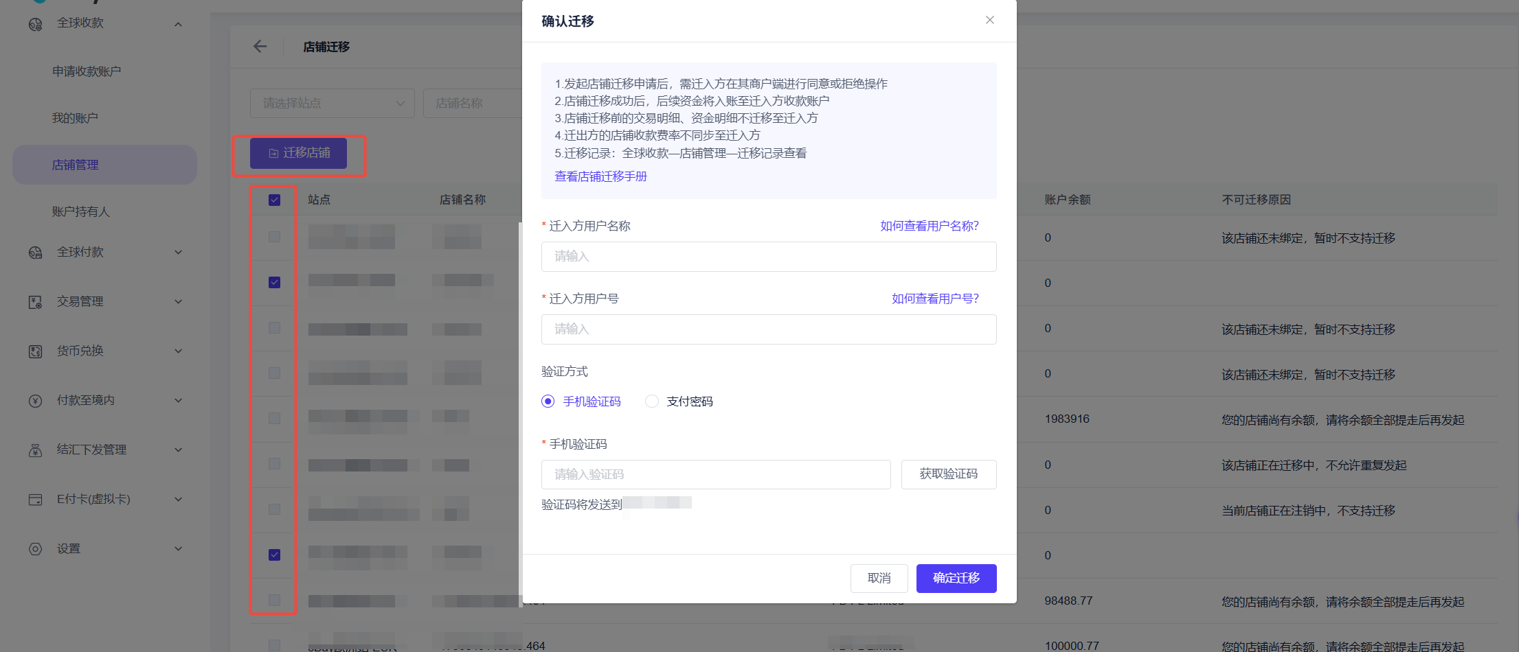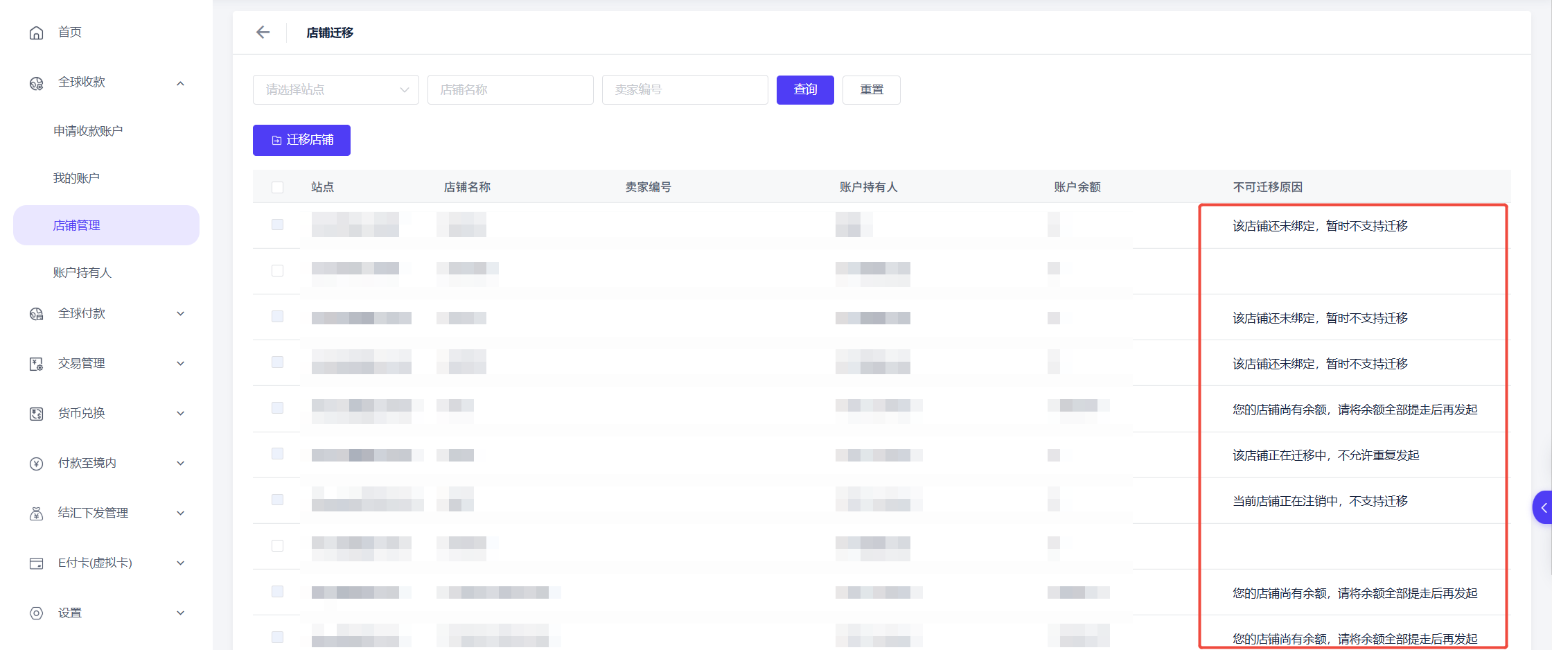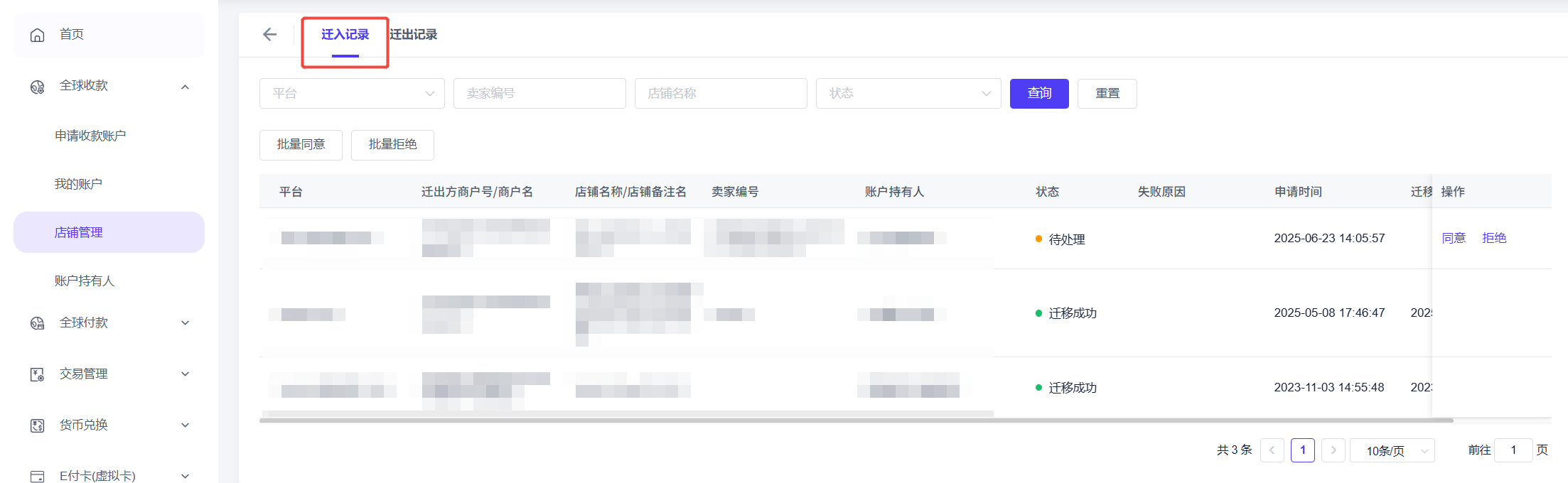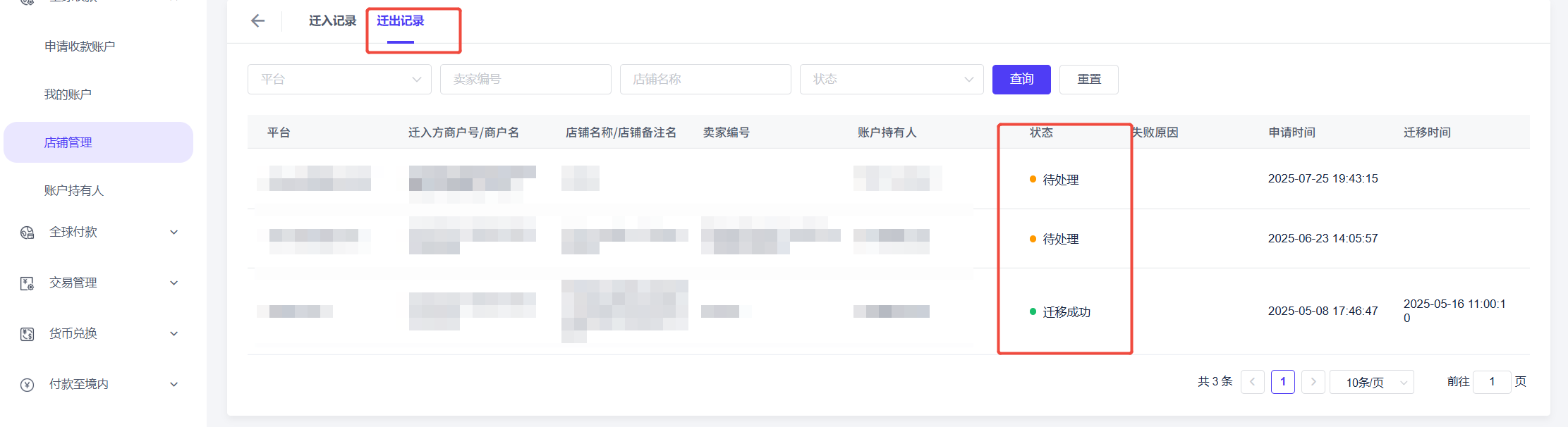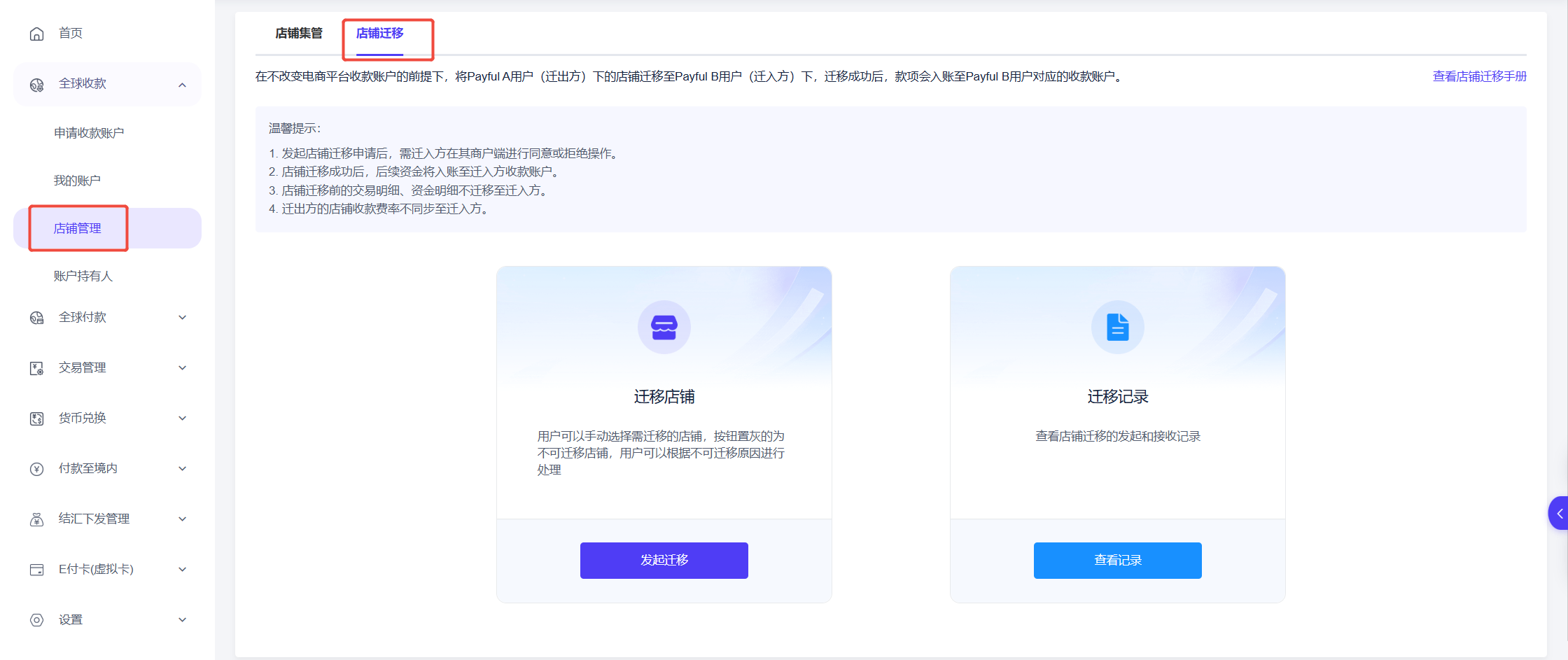 6.迁移记录:全球收款—店铺管理—迁移记录查看
