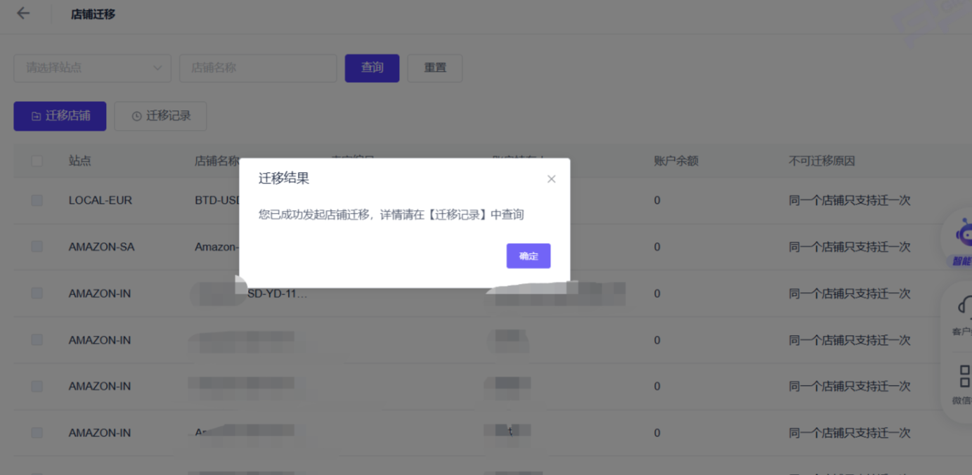 支持多店铺迁移,勾选需要迁移的店铺后点击“店铺迁移”