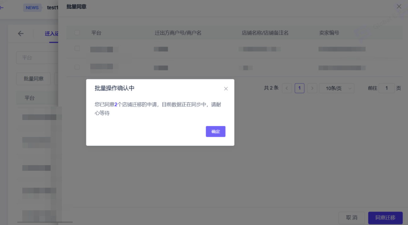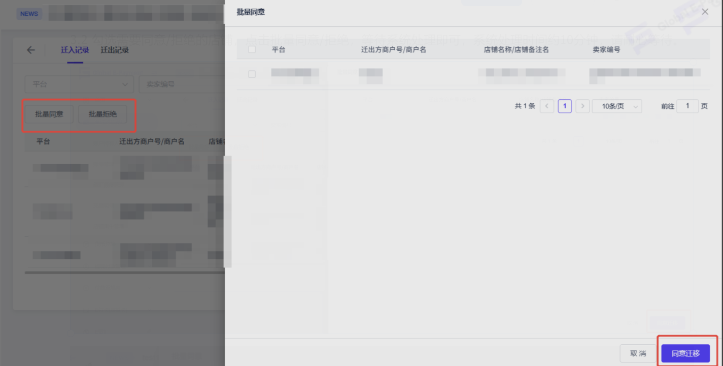2.发起店铺迁移申请后,需迁入方在其商户端进行同意或拒绝操作