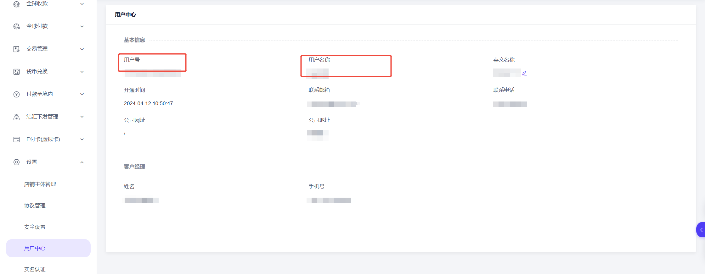 迁入方名称&用户编号:注册Payful用户的实名认证名称。查询路径:登录商户端,鼠标移动至右上角蓝色头像处,点击【用户中心】,对应填写【基本信息】页面的用户号与用户名称