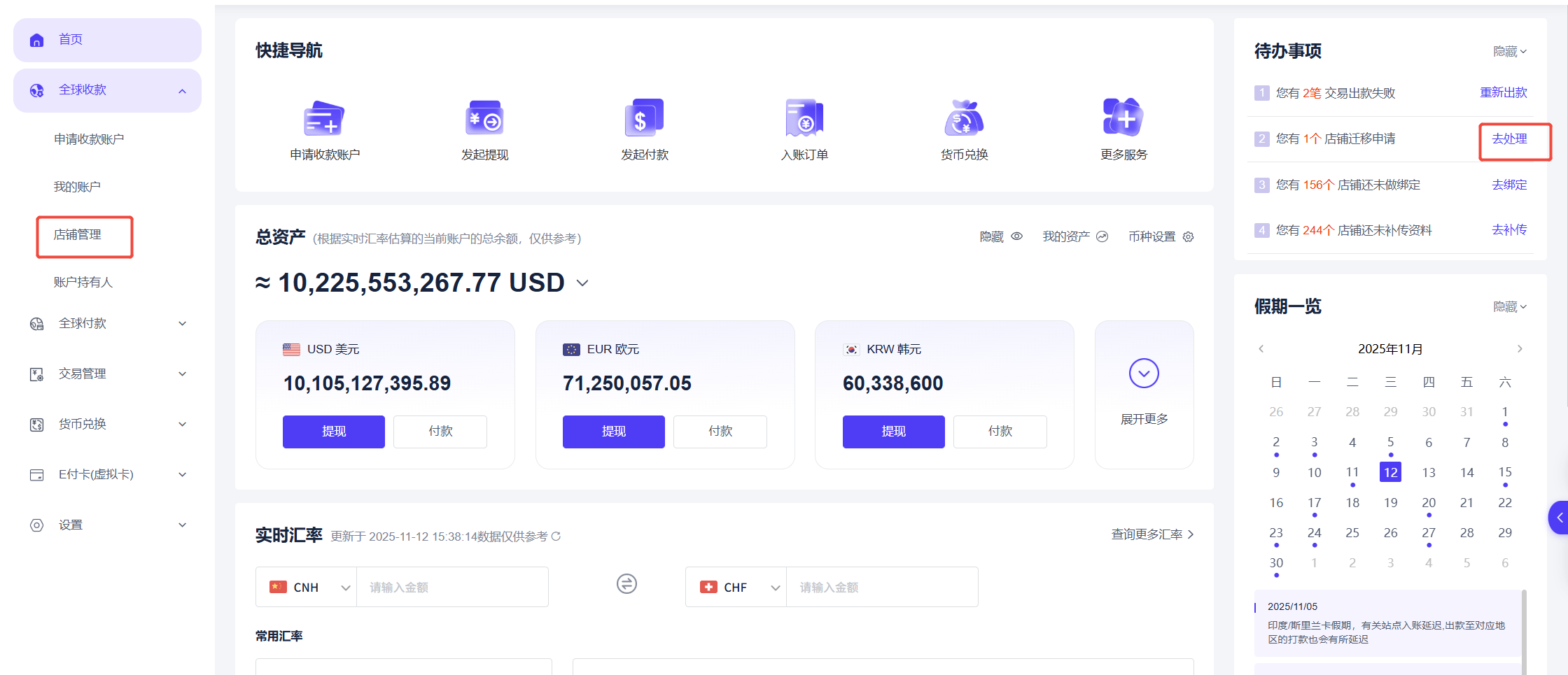 2.1 登录商户端,前往【全球收款】-【店铺管理】菜单,点击【店铺迁移】