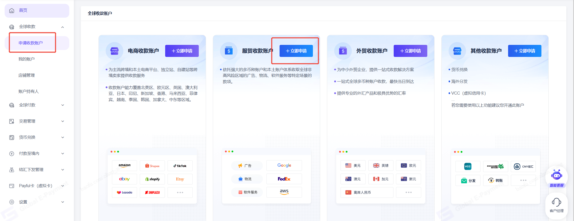 暂无相关搜索结果! 注册认证注册指引注册常见问题实名认证账户安全跨境电商账号使用指南收款管理申请收款账号查看收款账号下载开户凭证如何绑定收款账号亚马逊更换提现账号指南亚马逊收款账号绑定指南Lazada菲律宾收款账户绑定指南Shopee印尼收款账户绑定指南Shopee泰国收款账户绑定指南Shopee马来收款账户绑定指南Shopee越南收款账户绑定指南Tiktok英国收款账户绑定指南Tiktok越南收款账号绑定指南Tiktok马来收款账号绑定指南Tiktok印尼收款账号绑定指南Tiktok美国收款账号绑定指南Naver本土店收款账户绑定指南Paypal收款账户绑定指南Stripe收款账户绑定指南11street绑定指南Gmarket绑定指南Leboncoin绑定指南订单额度管理付款管理出款失败重新出款店铺管理补充店铺信息店铺集管店铺迁移店铺授权Shoplazza授权指南etsy店铺授权Tiktok店铺授权亚马逊电商平台授权eBay店铺授权跨境服贸账号使用指南收款管理申请账号账户详情收款入账提现&付款付款管理全球付款交易管理外贸B2B产品使用指南收款收款能力&注意事项申请收款账户收款操作结汇&海外付款货币兑换账户间转账操作员管理&权限设置帮助中心虚拟卡VCC使用指南关于Payful卡资金转入/转出常规卡共享卡母子账户自动转入数据看板Q&A操作说明汇总新功能介绍26年3月产品上新 申请账号 修改时间:2024-06-27 16:03:35 +0800 CST 分享 下载 PDF Markdown 打印 申请账号菜单:全球收款—申请收款账户-服贸收款账户—立即申请 根据行业类型(广告、物流)、账户类型(全球账户、本地账户)申请对应的收款账户;开户方式:支持已有平台、暂无平台两种模式如选择已有平台,则需在开户时即提交开户材料;如选择暂无平台,则在资金入账前提交相应平台材料; 继续添加平台:服贸业务一个账户可关联多个平台,各平台入账入账资金均会关注账户与平台的关联情况