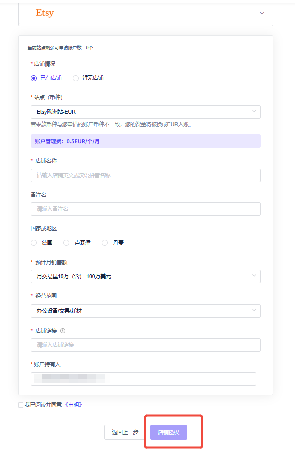 暂无相关搜索结果! 注册认证注册指引注册常见问题实名认证账户安全跨境电商账号使用指南收款管理申请收款账号查看收款账号下载开户凭证如何绑定收款账号亚马逊更换提现账号指南亚马逊收款账号绑定指南Lazada菲律宾收款账户绑定指南Shopee印尼收款账户绑定指南Shopee泰国收款账户绑定指南Shopee马来收款账户绑定指南Shopee越南收款账户绑定指南Tiktok英国收款账户绑定指南Tiktok越南收款账号绑定指南Tiktok马来收款账号绑定指南Tiktok印尼收款账号绑定指南Tiktok美国收款账号绑定指南Naver本土店收款账户绑定指南Paypal收款账户绑定指南Stripe收款账户绑定指南11street绑定指南Gmarket绑定指南Leboncoin绑定指南订单额度管理付款管理出款失败重新出款店铺管理补充店铺信息店铺集管店铺迁移店铺授权Shoplazza授权指南etsy店铺授权Tiktok店铺授权亚马逊电商平台授权eBay店铺授权跨境服贸账号使用指南收款管理申请账号账户详情收款入账提现&付款付款管理全球付款交易管理外贸B2B产品使用指南收款收款能力&注意事项申请收款账户收款操作结汇&海外付款货币兑换账户间转账操作员管理&权限设置帮助中心虚拟卡VCC使用指南关于Payful卡资金转入/转出常规卡共享卡母子账户自动转入数据看板Q&A操作说明汇总新功能介绍26年3月产品上新 etsy店铺授权 修改时间:2024-06-27 16:03:35 +0800 CST 分享 下载 PDF Markdown 打印 Etsy店铺授权第一步,店铺情况选择“已有店铺” ,按页面提示填写相关内容后,点击”店铺授权” 第二步,登录Etsy后台 第三步,点击 “Grant access”.等待Etsy返回。 第四步、授权成功后会自动跳回到Payful页面,系统会提示申请成功,在1-2分钟内分配账号