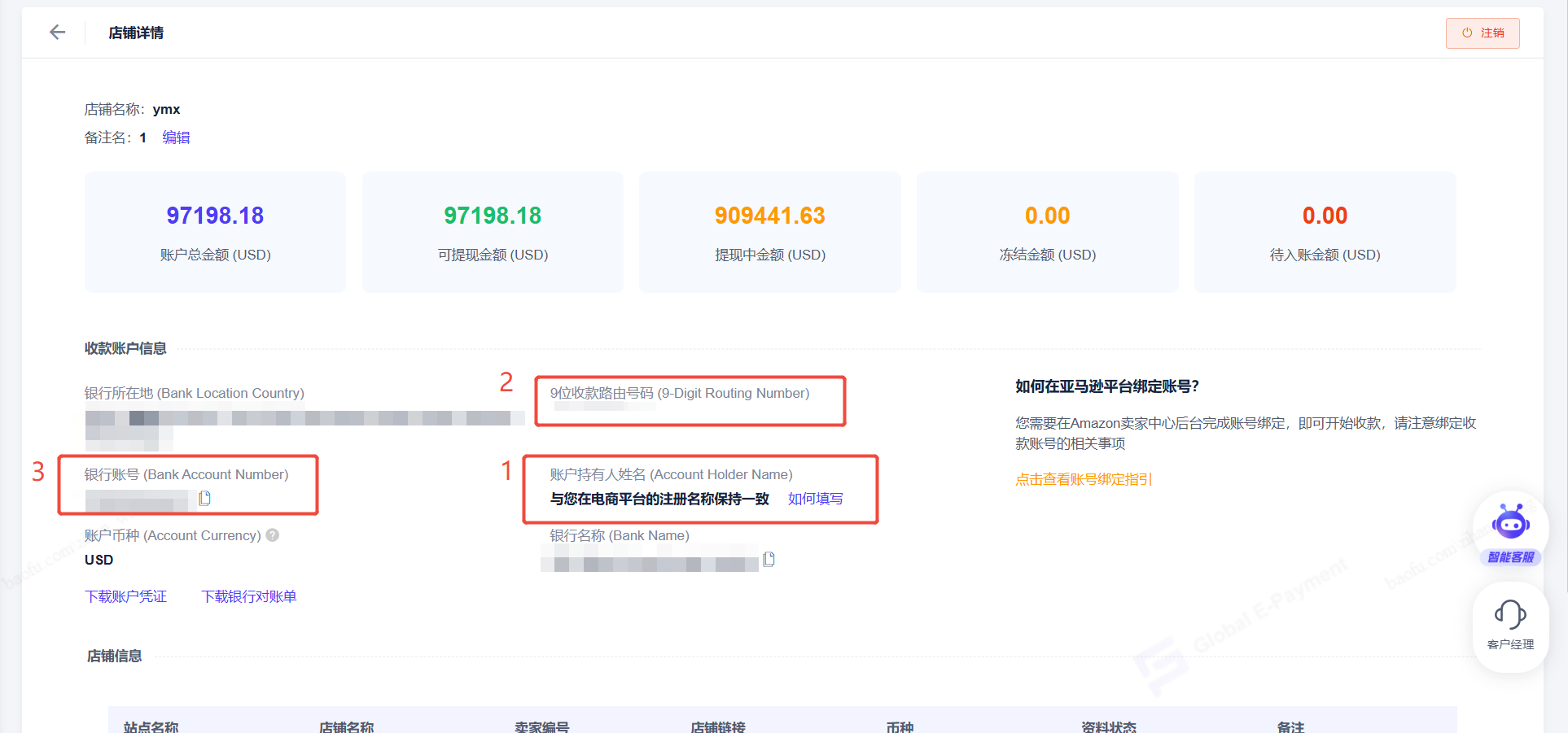 将Payful银行账号收款账户信息里的:账号持有人姓名(Account Holder Name)、9位收款路由号码 (9-Digit Routing Number)、银行账号(Bank Account Number)按照下图标识的序号对应填入即可。(部分亚马逊系统只要求填写新的收款账户信息,无需填写当前的收款账户信息)