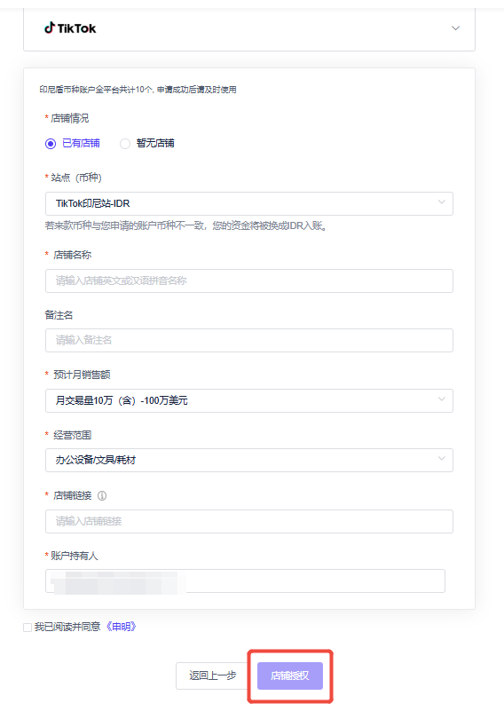 暂无相关搜索结果! 注册认证注册指引注册常见问题实名认证账户安全跨境电商账号使用指南收款管理申请收款账号查看收款账号下载开户凭证如何绑定收款账号亚马逊更换提现账号指南亚马逊收款账号绑定指南Lazada菲律宾收款账户绑定指南Shopee印尼收款账户绑定指南Shopee泰国收款账户绑定指南Shopee马来收款账户绑定指南Shopee越南收款账户绑定指南Tiktok英国收款账户绑定指南Tiktok越南收款账号绑定指南Tiktok马来收款账号绑定指南Tiktok印尼收款账号绑定指南Tiktok美国收款账号绑定指南Naver本土店收款账户绑定指南Paypal收款账户绑定指南Stripe收款账户绑定指南11street绑定指南Gmarket绑定指南Leboncoin绑定指南订单额度管理付款管理出款失败重新出款店铺管理补充店铺信息店铺集管店铺迁移店铺授权Shoplazza授权指南etsy店铺授权Tiktok店铺授权亚马逊电商平台授权eBay店铺授权跨境服贸账号使用指南收款管理申请账号账户详情收款入账提现&付款付款管理全球付款交易管理外贸B2B产品使用指南收款收款能力&注意事项申请收款账户收款操作结汇&海外付款货币兑换账户间转账操作员管理&权限设置帮助中心虚拟卡VCC使用指南关于Payful卡资金转入/转出常规卡共享卡母子账户自动转入数据看板Q&A操作说明汇总新功能介绍26年3月产品上新 Tiktok店铺授权 修改时间:2024-06-27 16:03:35 +0800 CST 分享 下载 PDF Markdown 打印 TikTok 授权引导第一步:登录Payful>申请收款账户>选择Tiktok对应站点>选择已有店铺>填写店铺信息 第二步:点击【店铺授权】,跳转至TikTok平台页面 第三步:选择账号归属区域 第四步:登录TikTok平台页面,勾选协议,点击确认按钮 第五步:授权成功后会自动跳回到Payyful页面,系统会提示申请成功。