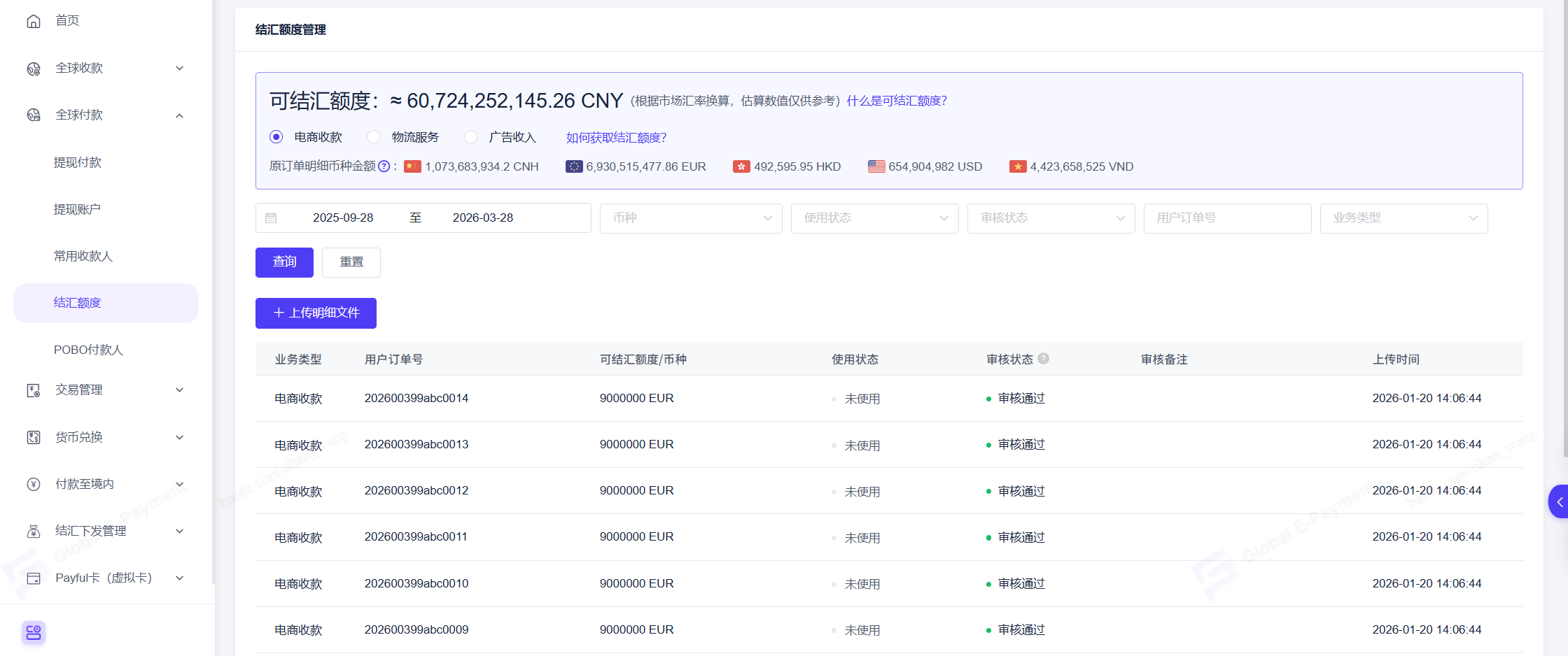 您可至全球付款-结汇额度菜单进行明细额度查看和交易明细上传