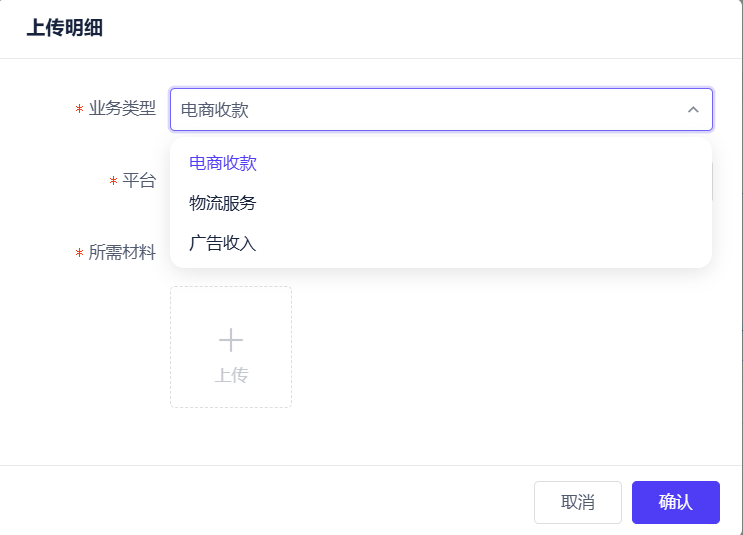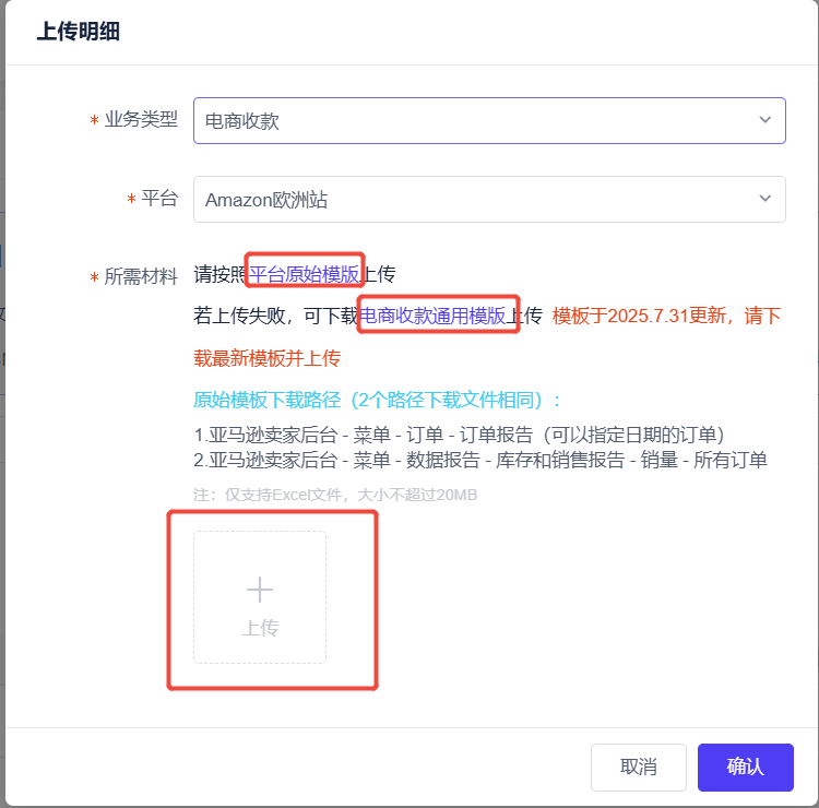 若您需要上传电商平台明细文件,可选择直接上传平台原始模板(若支持),或上传通用模板