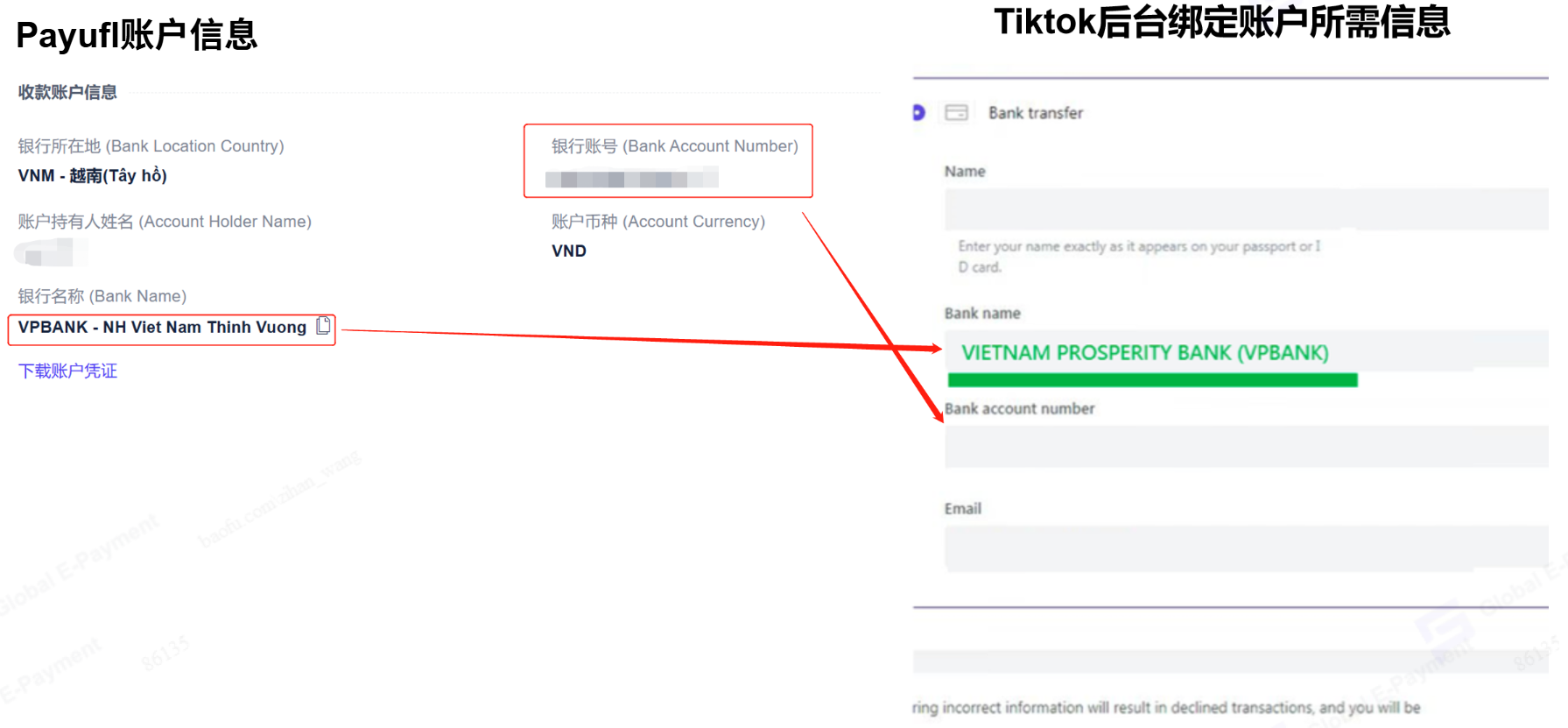 暂无相关搜索结果! 注册认证注册指引注册常见问题实名认证账户安全跨境电商账号使用指南收款管理申请收款账号查看收款账号下载开户凭证如何绑定收款账号亚马逊更换提现账号指南亚马逊收款账号绑定指南Lazada菲律宾收款账户绑定指南Shopee印尼收款账户绑定指南Shopee泰国收款账户绑定指南Shopee马来收款账户绑定指南Shopee越南收款账户绑定指南Tiktok英国收款账户绑定指南Tiktok越南收款账号绑定指南Tiktok马来收款账号绑定指南Tiktok印尼收款账号绑定指南Tiktok美国收款账号绑定指南Naver本土店收款账户绑定指南Paypal收款账户绑定指南Stripe收款账户绑定指南11street绑定指南Gmarket绑定指南Leboncoin绑定指南订单额度管理付款管理出款失败重新出款店铺管理补充店铺信息店铺集管店铺迁移店铺授权Shoplazza授权指南etsy店铺授权Tiktok店铺授权亚马逊电商平台授权eBay店铺授权跨境服贸账号使用指南收款管理申请账号账户详情收款入账提现&付款付款管理全球付款交易管理外贸B2B产品使用指南收款收款能力&注意事项申请收款账户收款操作结汇&海外付款货币兑换账户间转账操作员管理&权限设置帮助中心虚拟卡VCC使用指南关于Payful卡资金转入/转出常规卡共享卡母子账户自动转入数据看板Q&A操作说明汇总新功能介绍26年3月产品上新 Tiktok越南收款账号绑定指南 修改时间:2024-06-27 16:03:35 +0800 CST 分享 下载 PDF Markdown 打印 Tiktok越南收款账号绑定指南